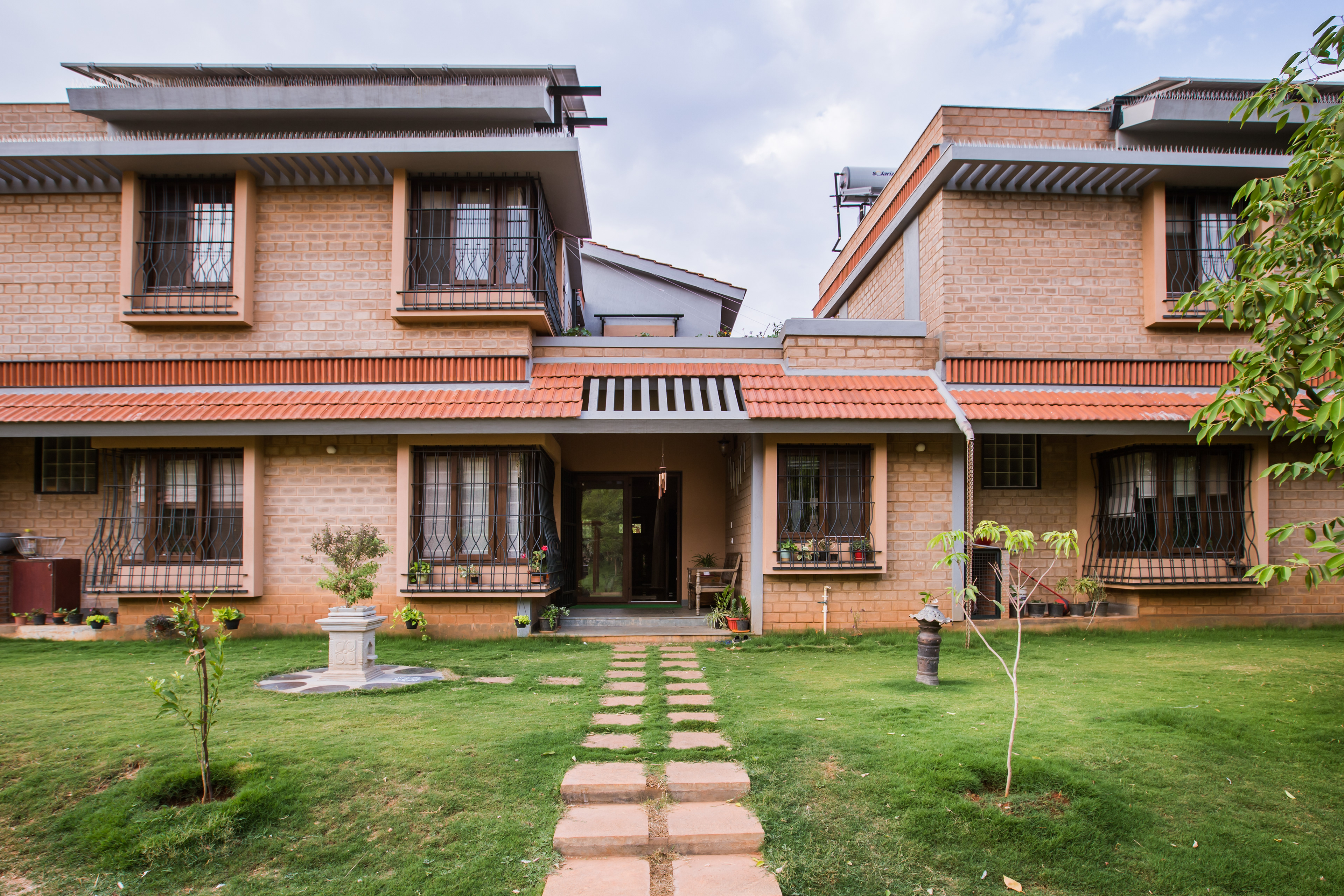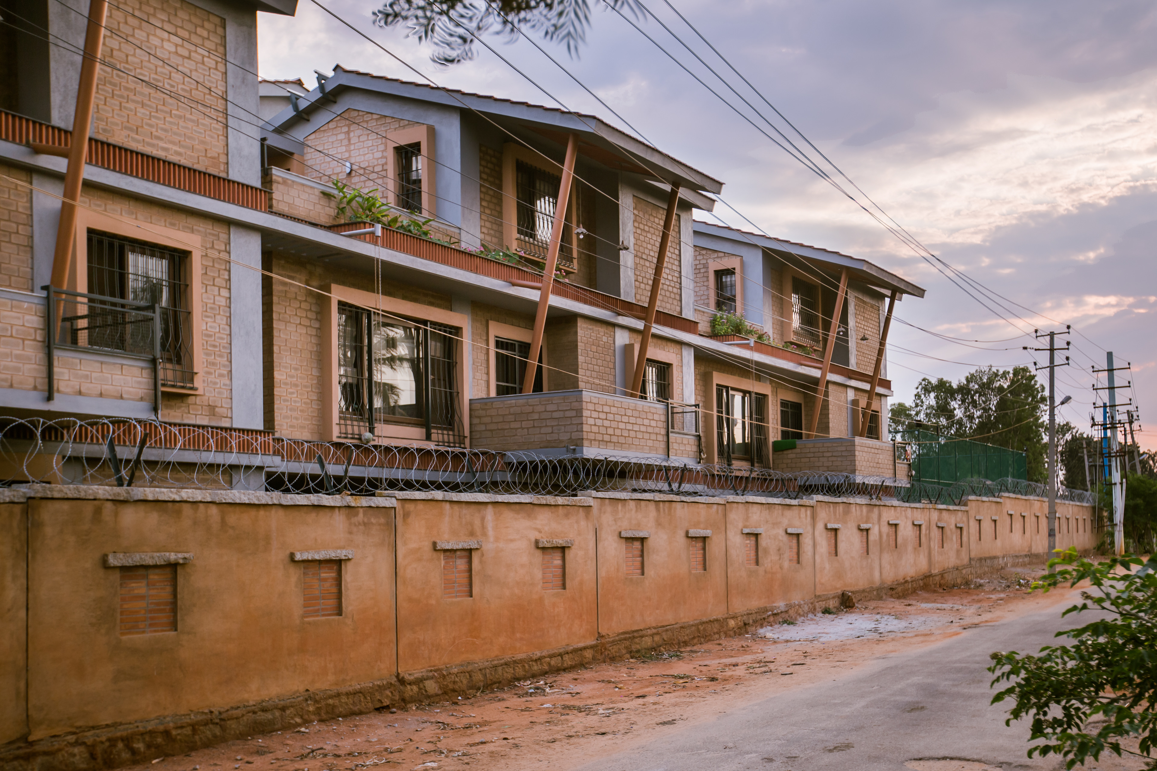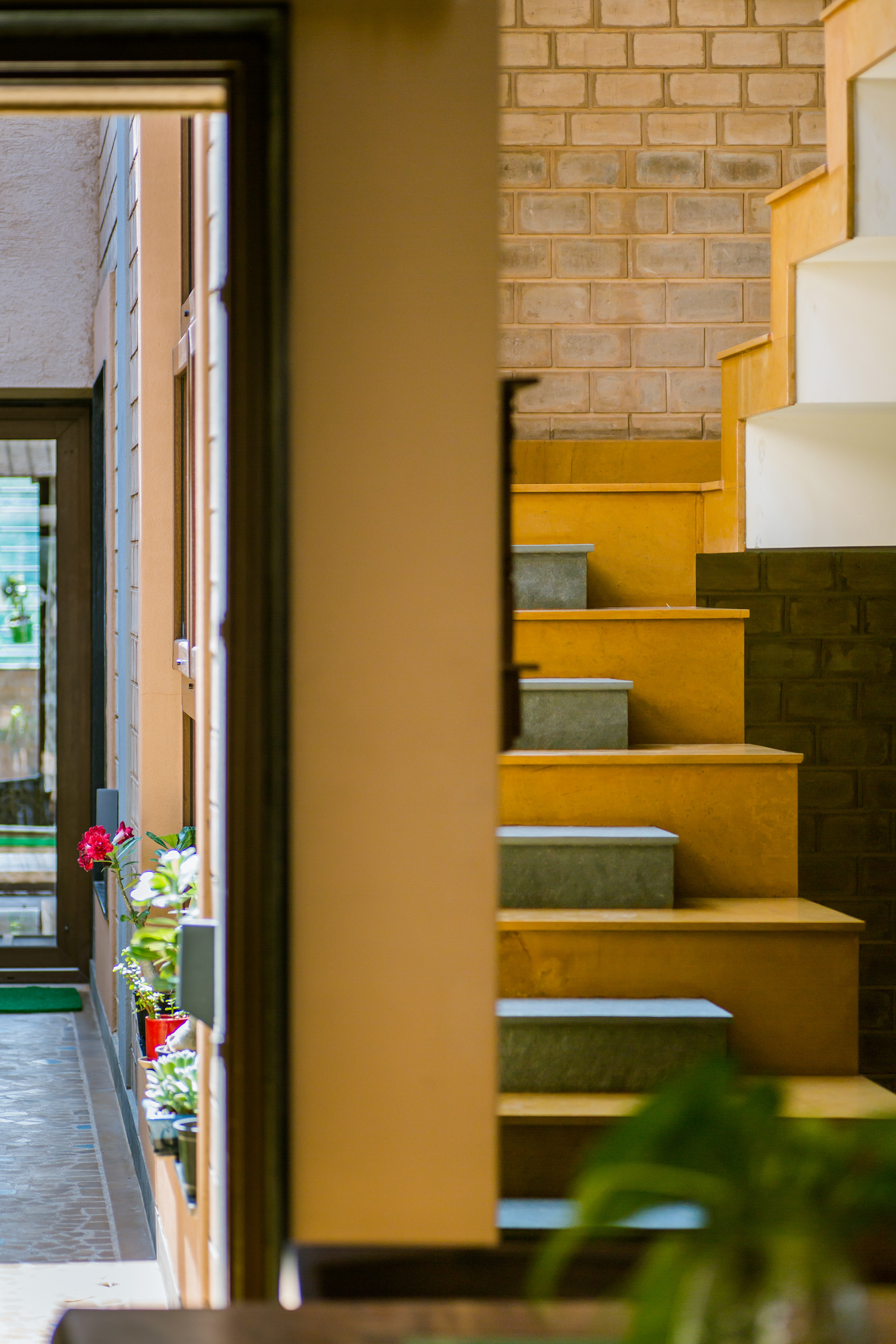 Three identically yet personalized homes for a large family. Made fully with stabilized mud blocks and bright yellow Jaisalmer flooring bringing back the village home and connected to nature.