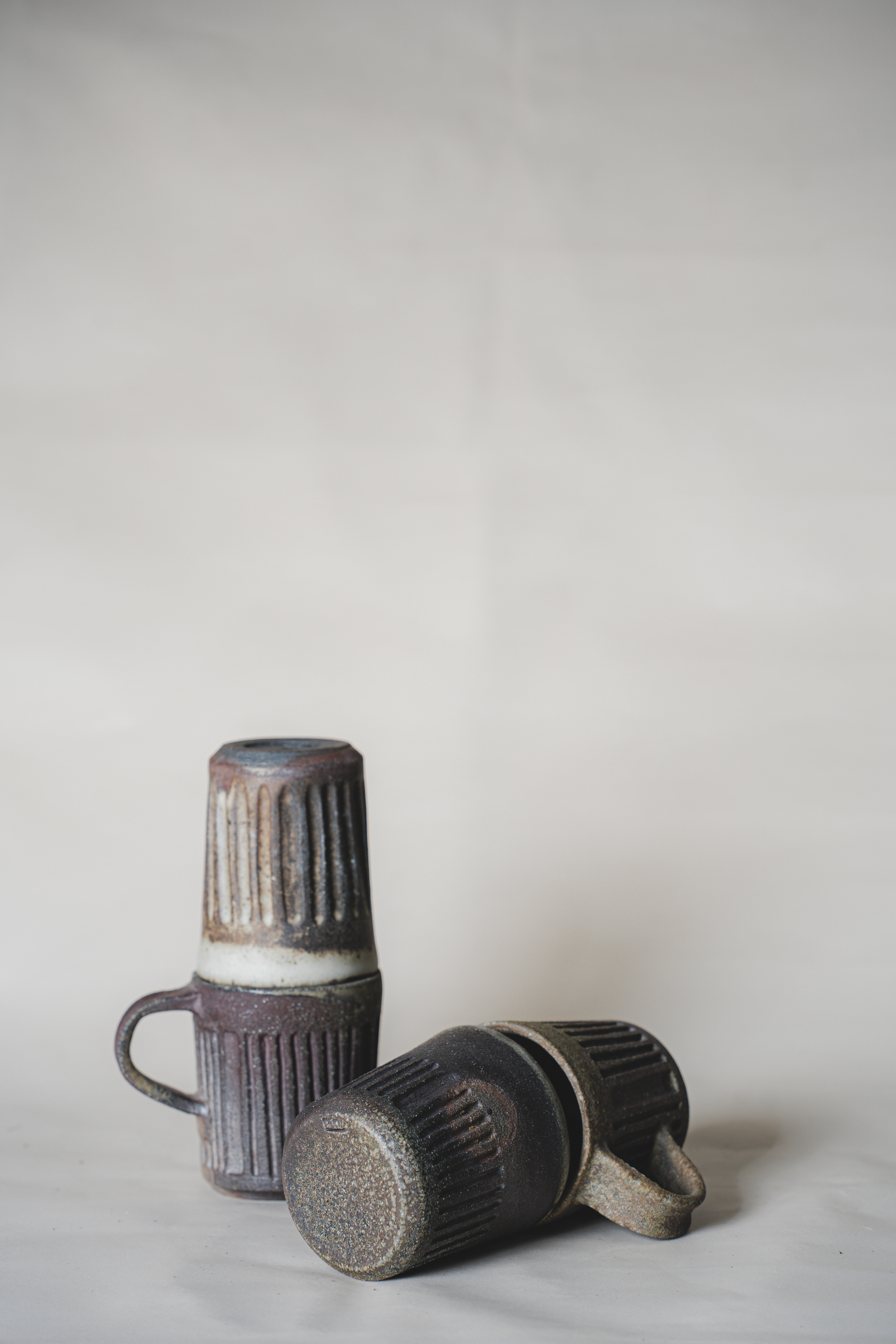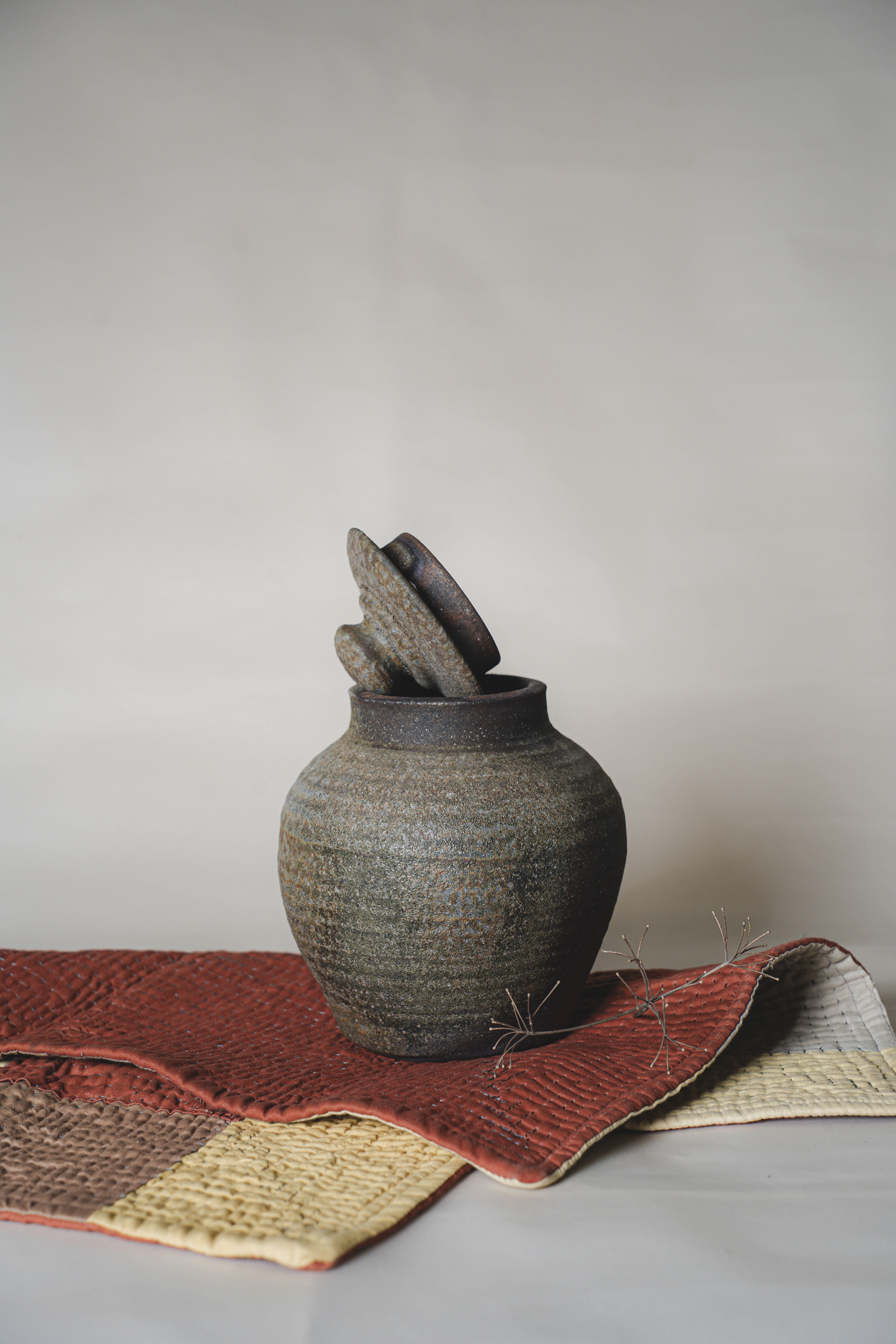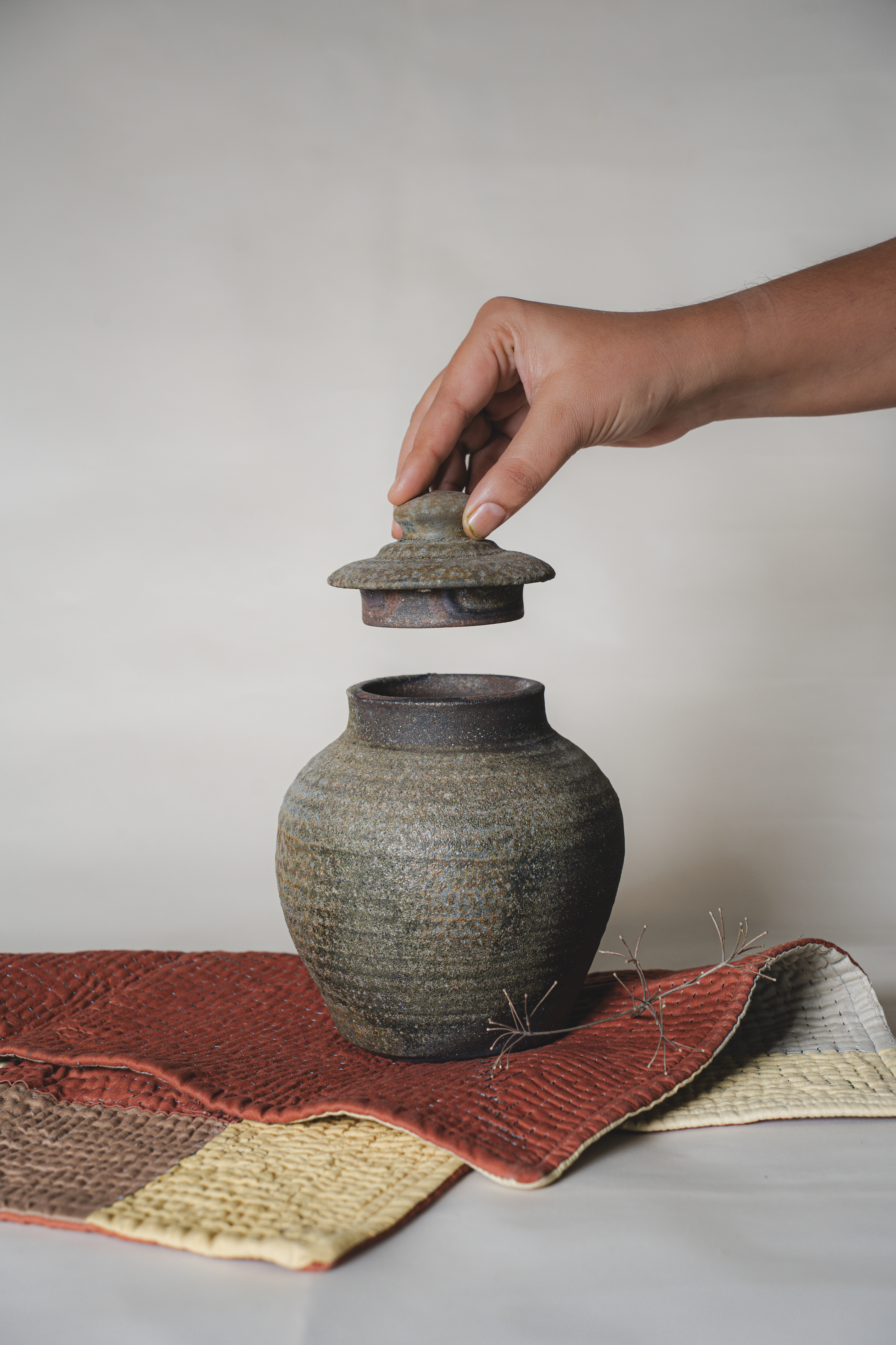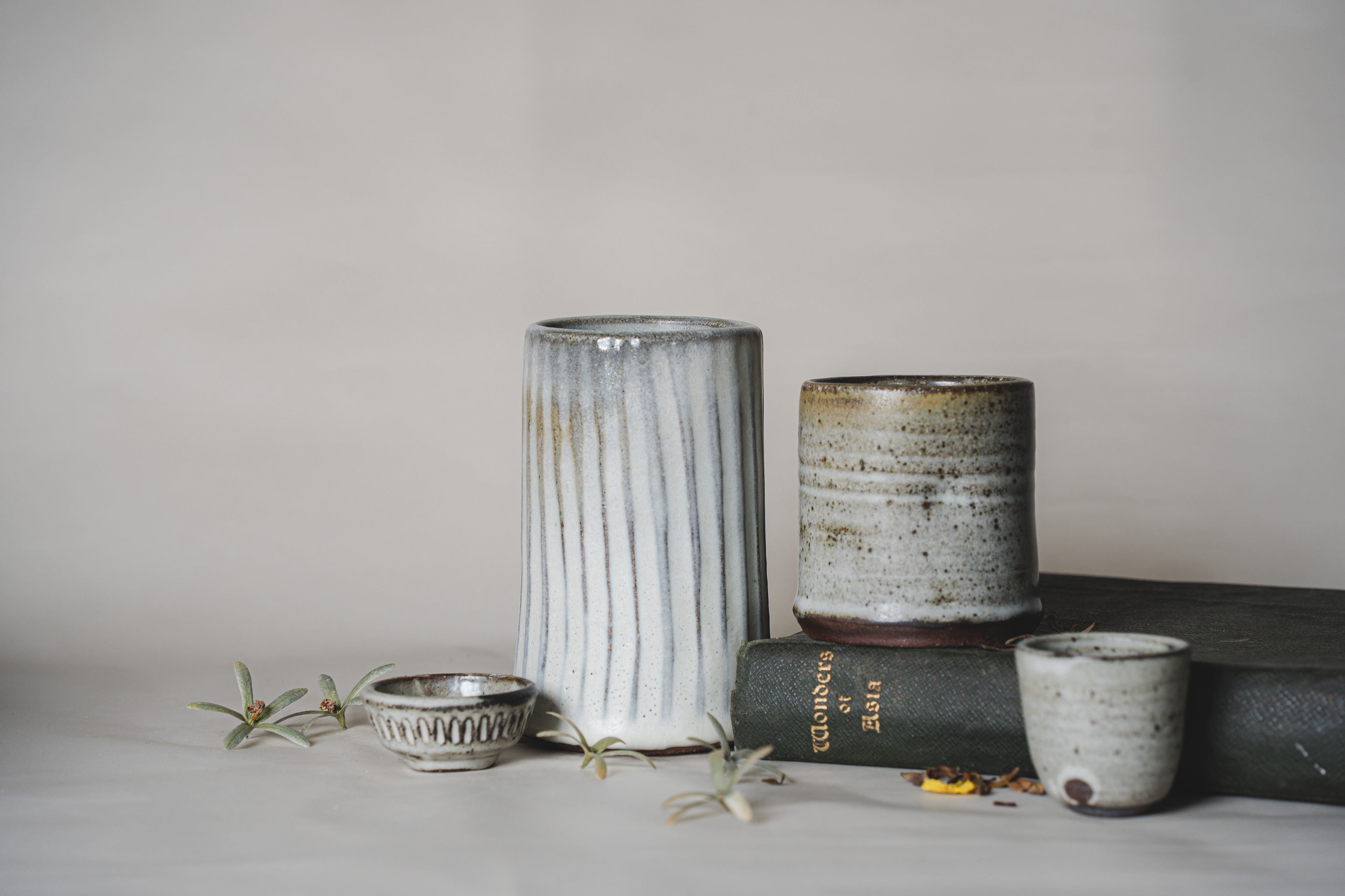 A range of wheel thrown, wood fired stoneware articles hand crafted by Prajna Rajanna, Motifs Of The Earth.