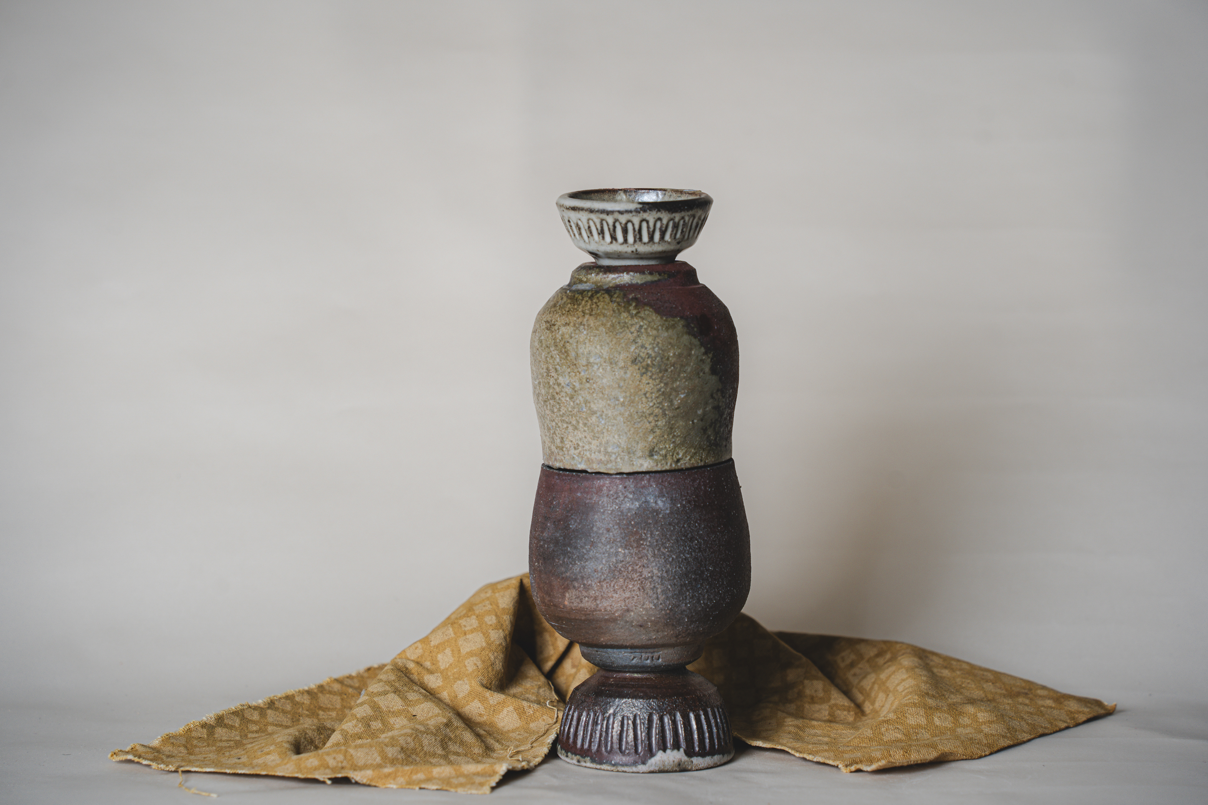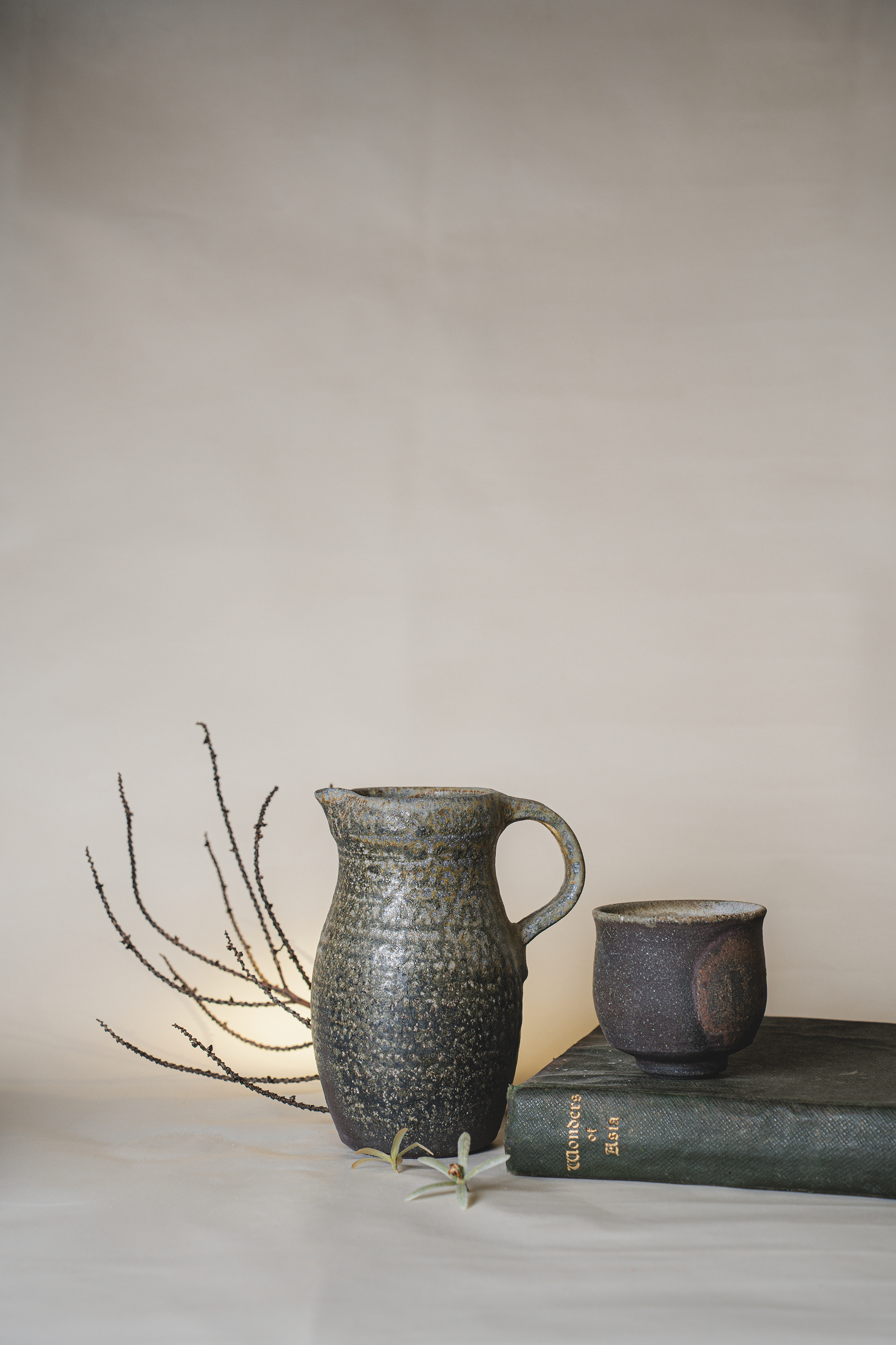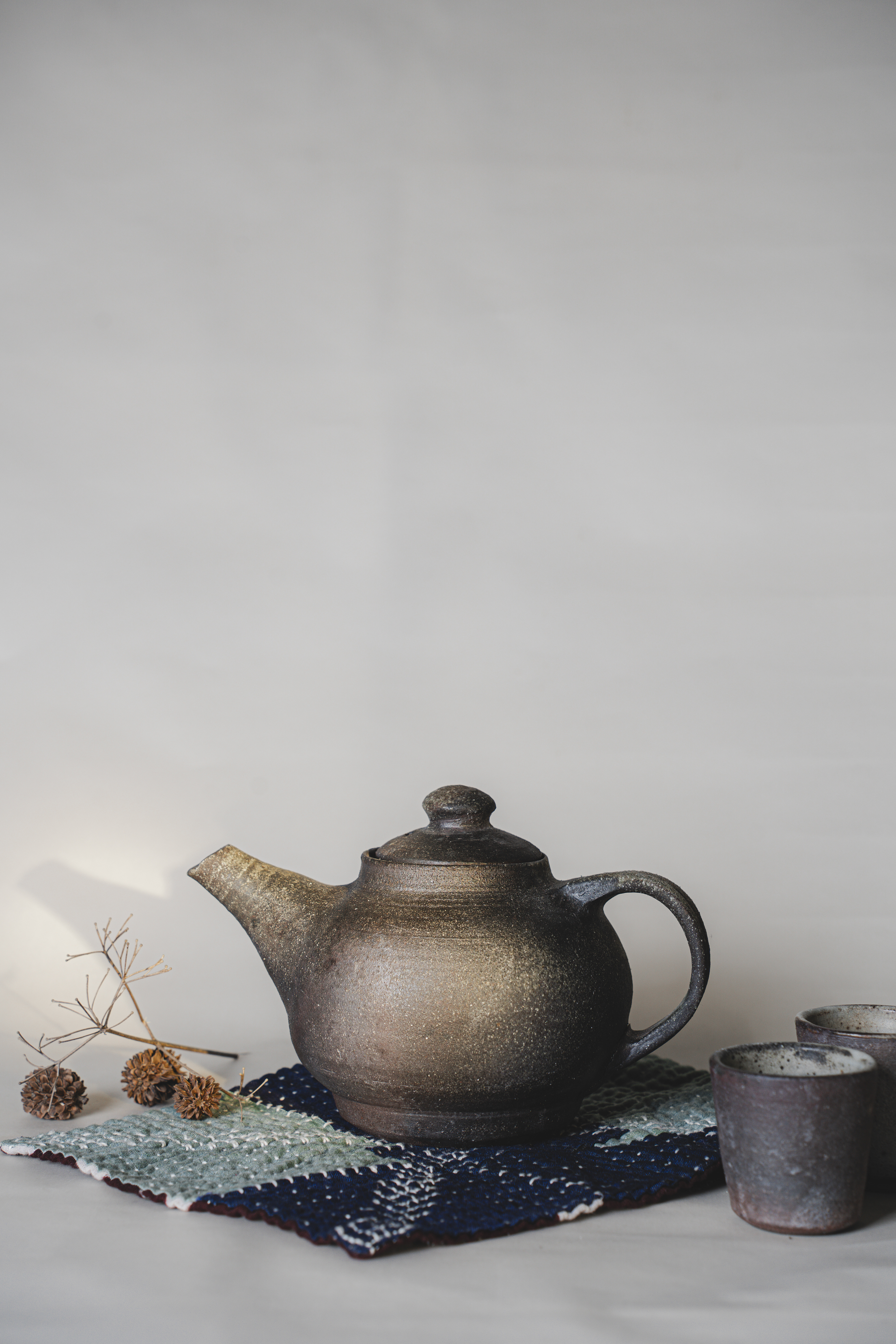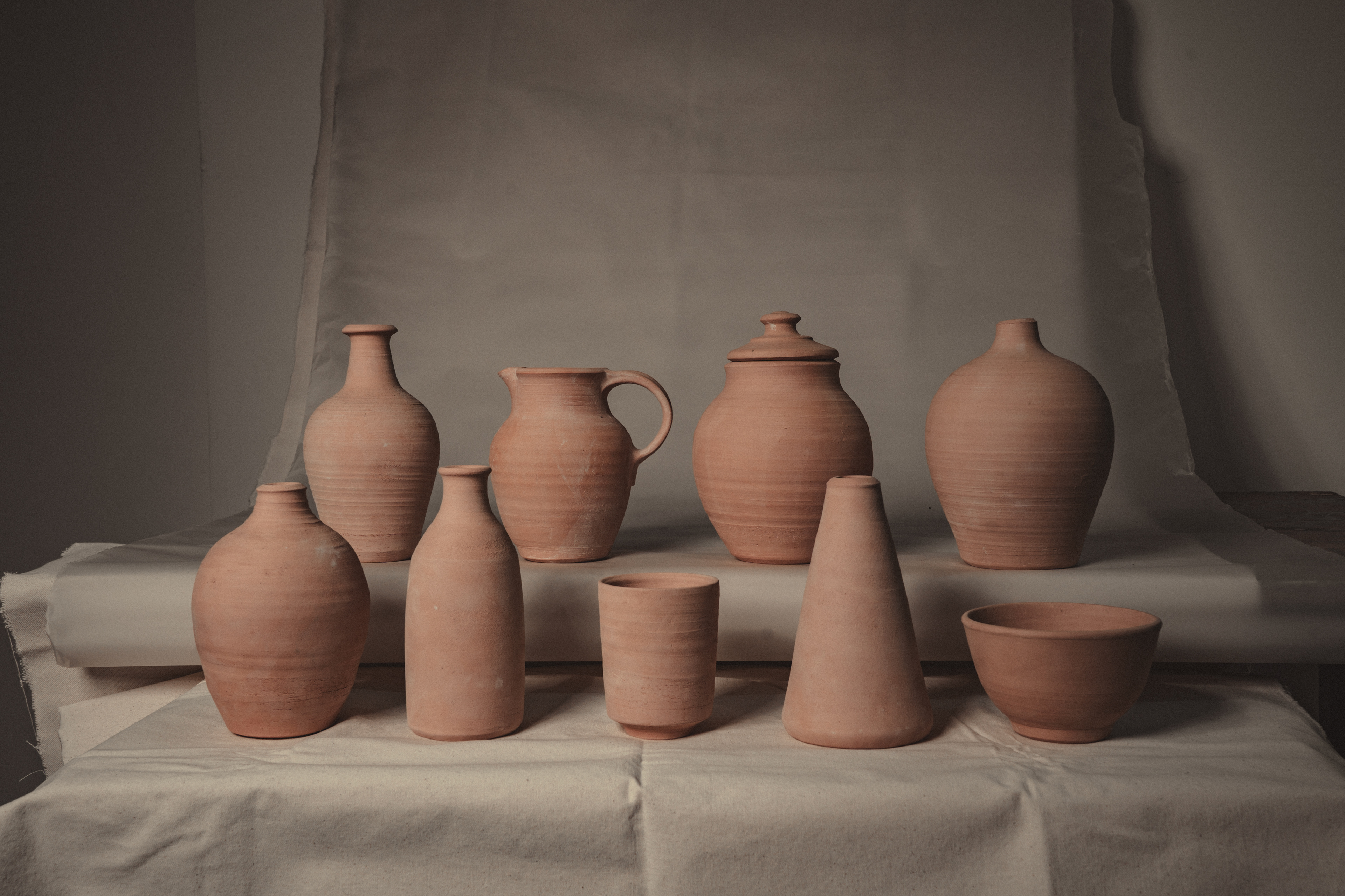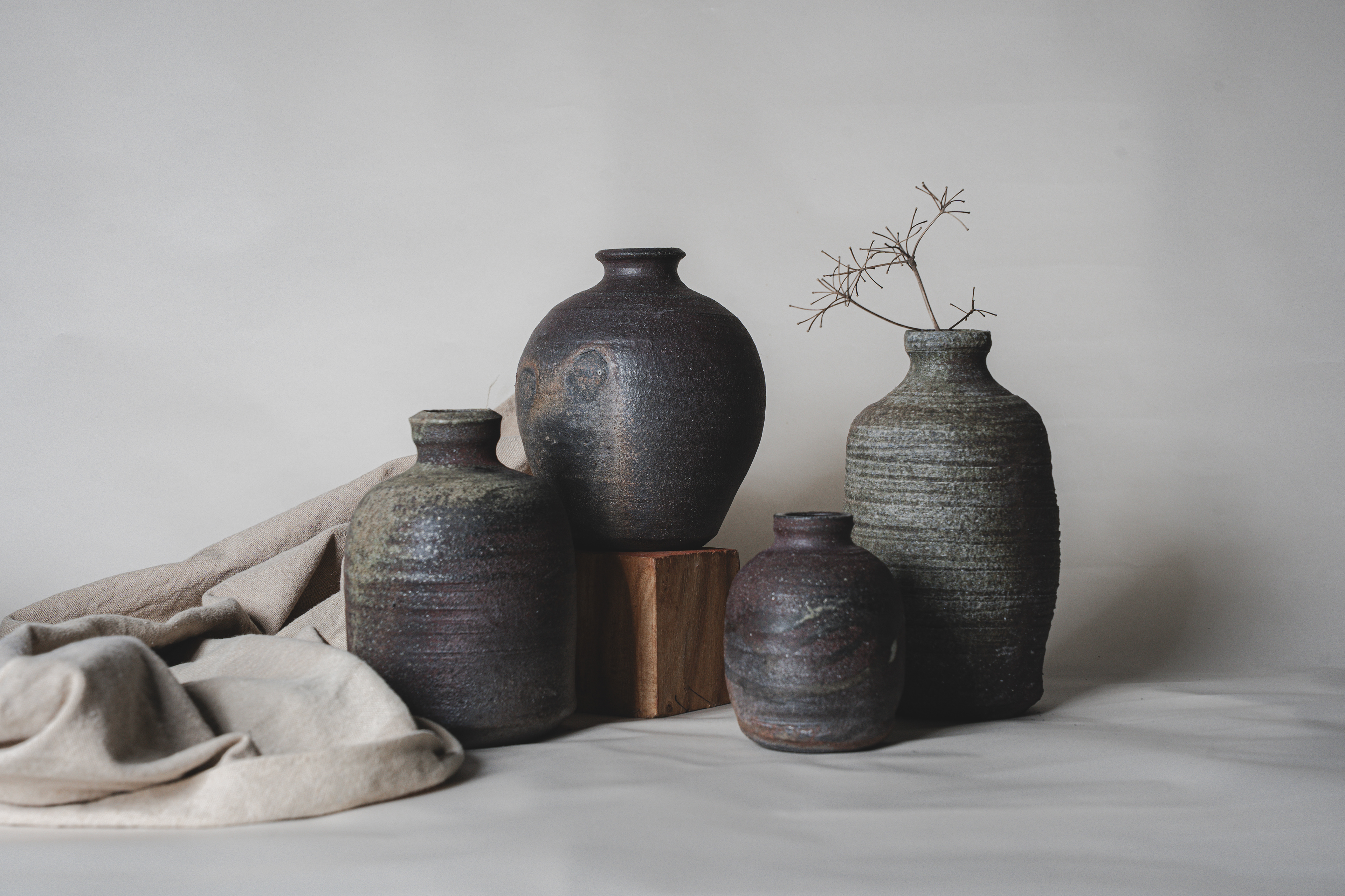 A range of wheel thrown, wood fired stoneware articles hand crafted by Prajna Rajanna, Motifs Of The Earth.